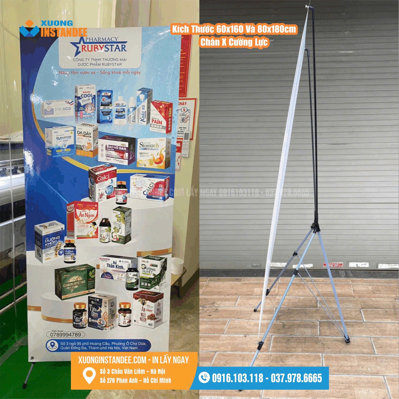In standee 0.8×1.8m – Giá 130k/tấm. Chân X cường lực – Giá 130k/chiếc. Tổng 260k/bộ.
