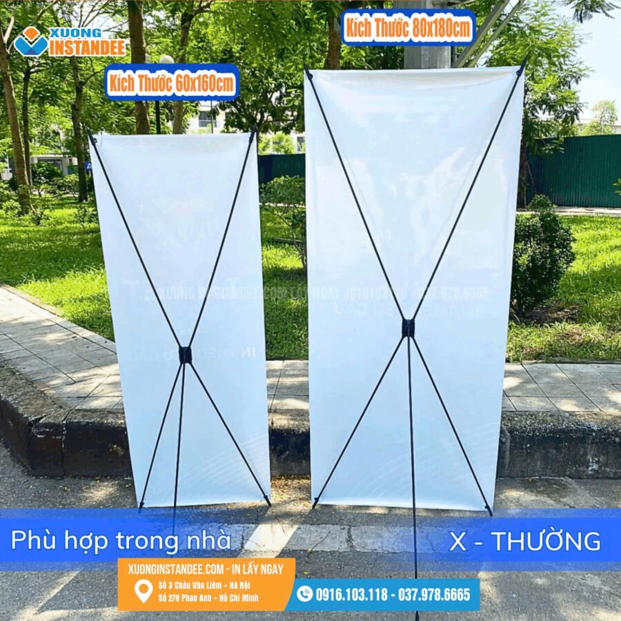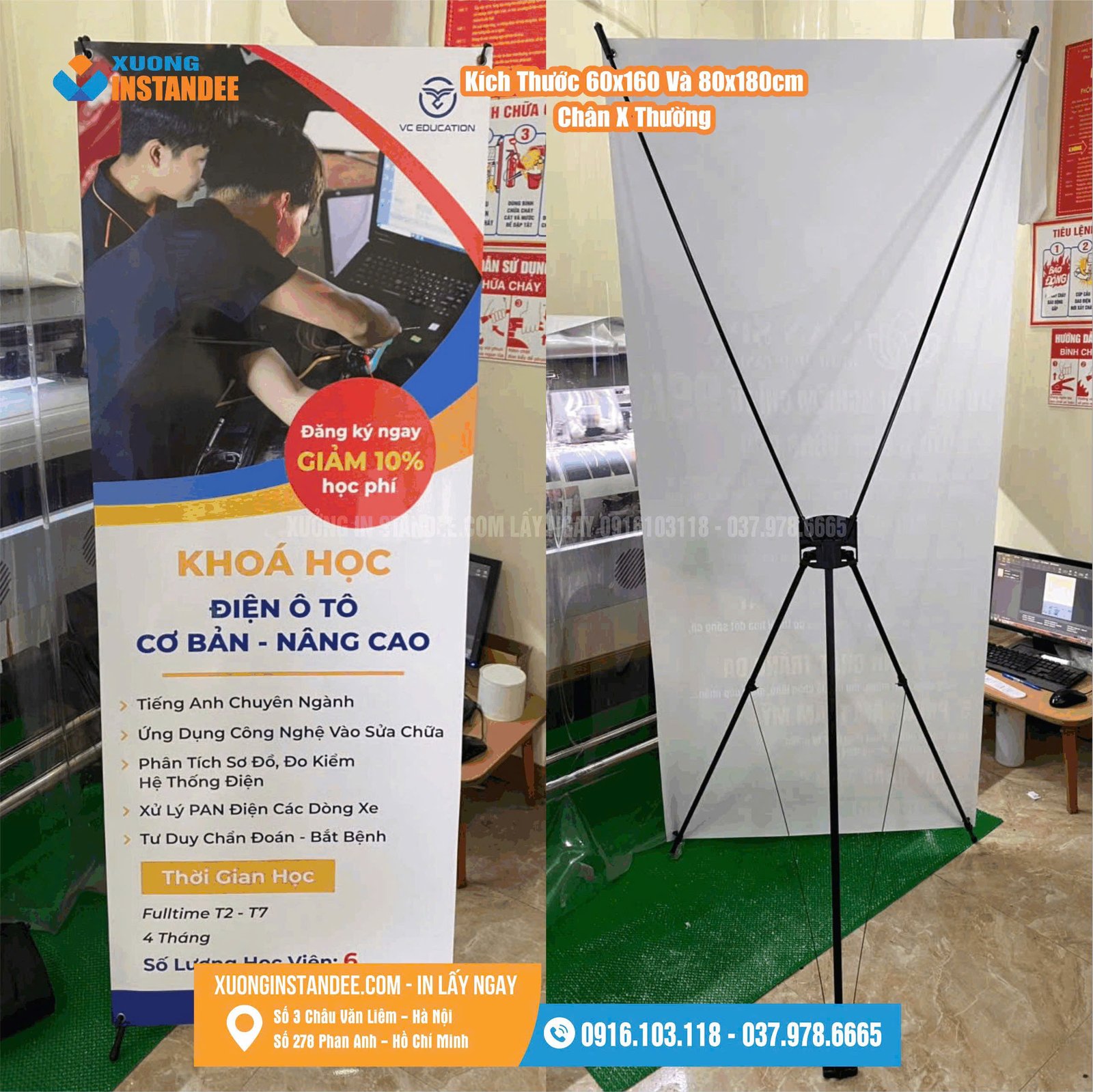 Loại Standee 80x180cm chân X thường (còn gọi là chân X nhựa hoặc chân X phổ thông khổ lớn) là lựa chọn rẻ nhất cho kích thước 80x180cm, phù hợp cho các sự kiện dùng một lần hoặc ngân sách thấp.