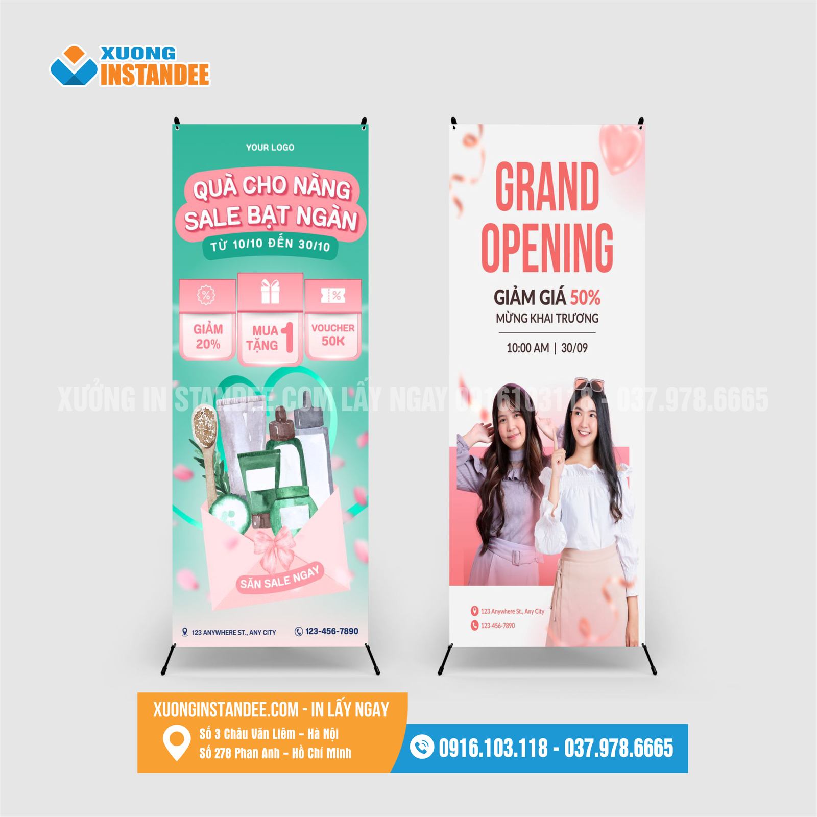 In standee chữ X kích thước 0.6×1.6m, chất liệu in PP cán bóng hoặc cán mờ. Bản in đẹp, chuẩn màu sắc thiết kế.